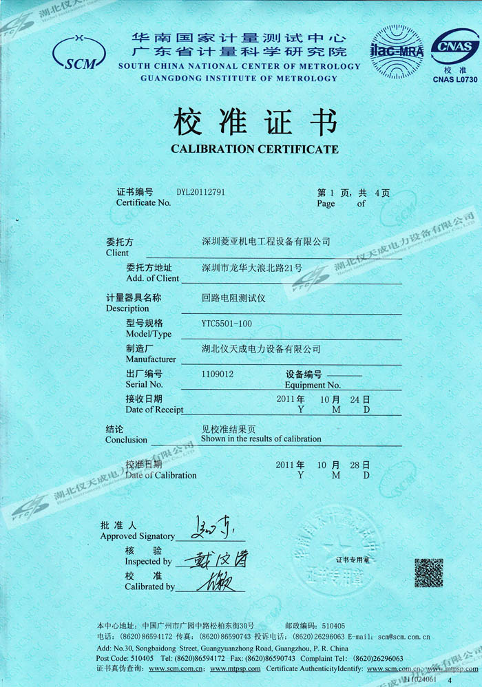 YTC5501-100A 回路電阻測(cè)試儀的資質(zhì)證書